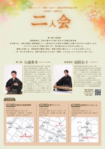 古典企画 > お知らせ > 池間 北斗 > 琉楽ユニット「奏琉〜soul〜」結成10周年記念公演 二人会 お知らせ INFORMATION 琉楽ユニット「奏琉〜soul〜」結成10周年記念公演 二人会 池間 北斗 2025.12.11 玉城流喜納喜利の会 西村利江子・綾織 母娘公演 継ぎゆく舞 琉球王国時代の演出による 舞踊と組踊「執心鐘入」 お知らせ一覧に戻る CATEGORY 仲村 逸夫 仲村・入嵩西・池間 仲村・池間 仲村逸夫・入嵩西諭 佐辺 良和 佐辺・仲村・入嵩西 佐辺・仲村・池間 佐辺・池間 佐辺良和・仲村逸夫 入嵩西 諭 入嵩西・池間 公演情報 古典企画 総出演 古典企画主催公演 池間 北斗 ARCHIVE 2025年12月 2025年11月 2025年9月 2025年7月 2025年6月 2025年5月 2025年4月 2025年3月 2025年1月 2024年11月 2024年10月 2024年9月 2024年8月 2024年7月 2024年5月 2024年3月 2024年2月 2024年1月 2023年12月 2023年11月 2023年10月 2023年9月 2023年7月 2023年5月 2023年4月 2023年3月 2023年2月 2023年1月 2022年10月 2022年9月